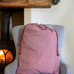 Crafted in classic burgundy and cream gingham and finished with a thick drawstring cord, perfect for nestling under the tree or beside the fireplace. Our sacks are handmade in the UK in durable, high quality cotton.