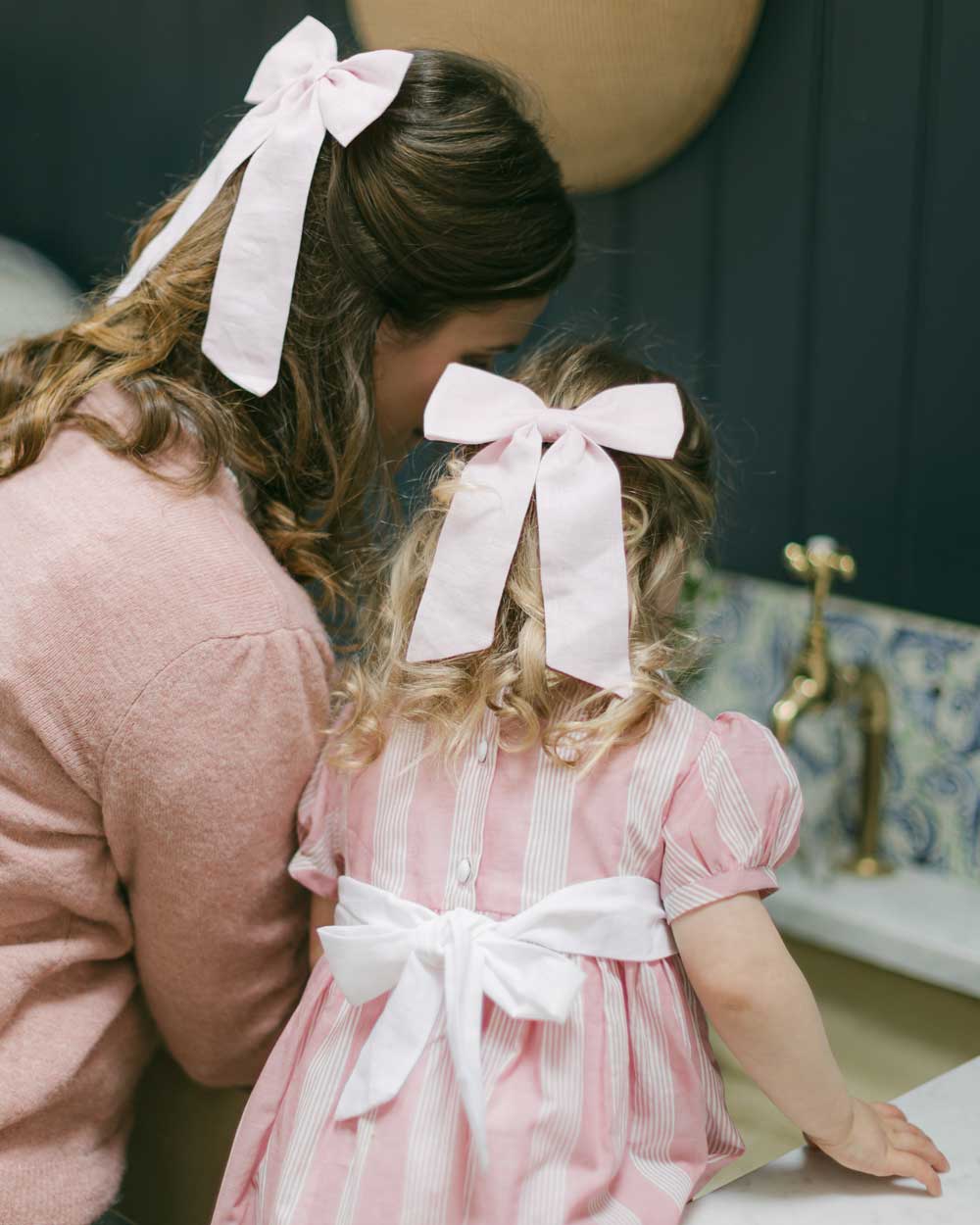 Please wash Clementine & Mint hairbows by spot cleaning with lukewarm water using gentle rubbing motions. Do not machine wash or tumble dry. Our Linen hair bows can be ironed on a low setting to remove creases.