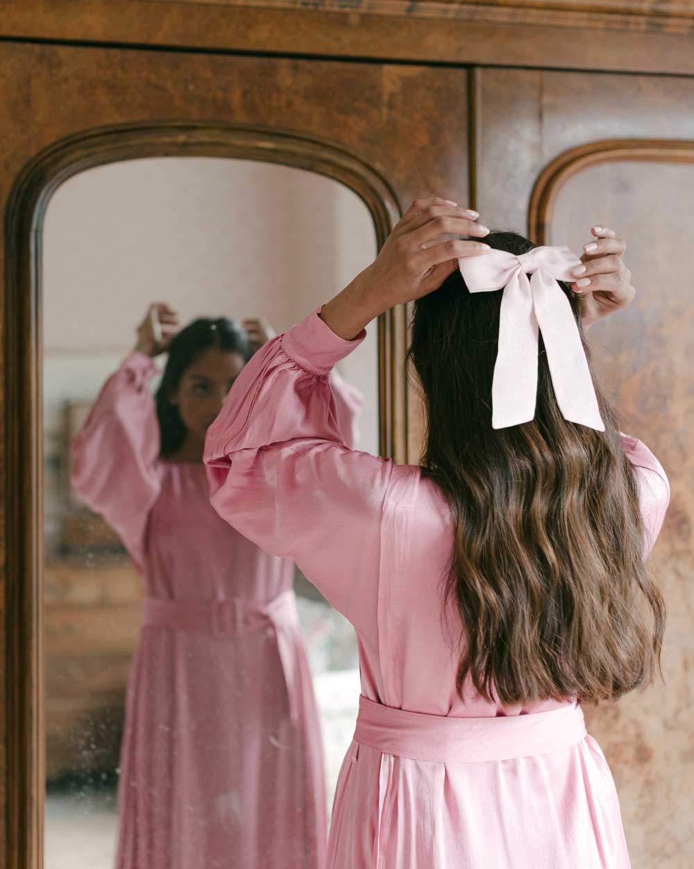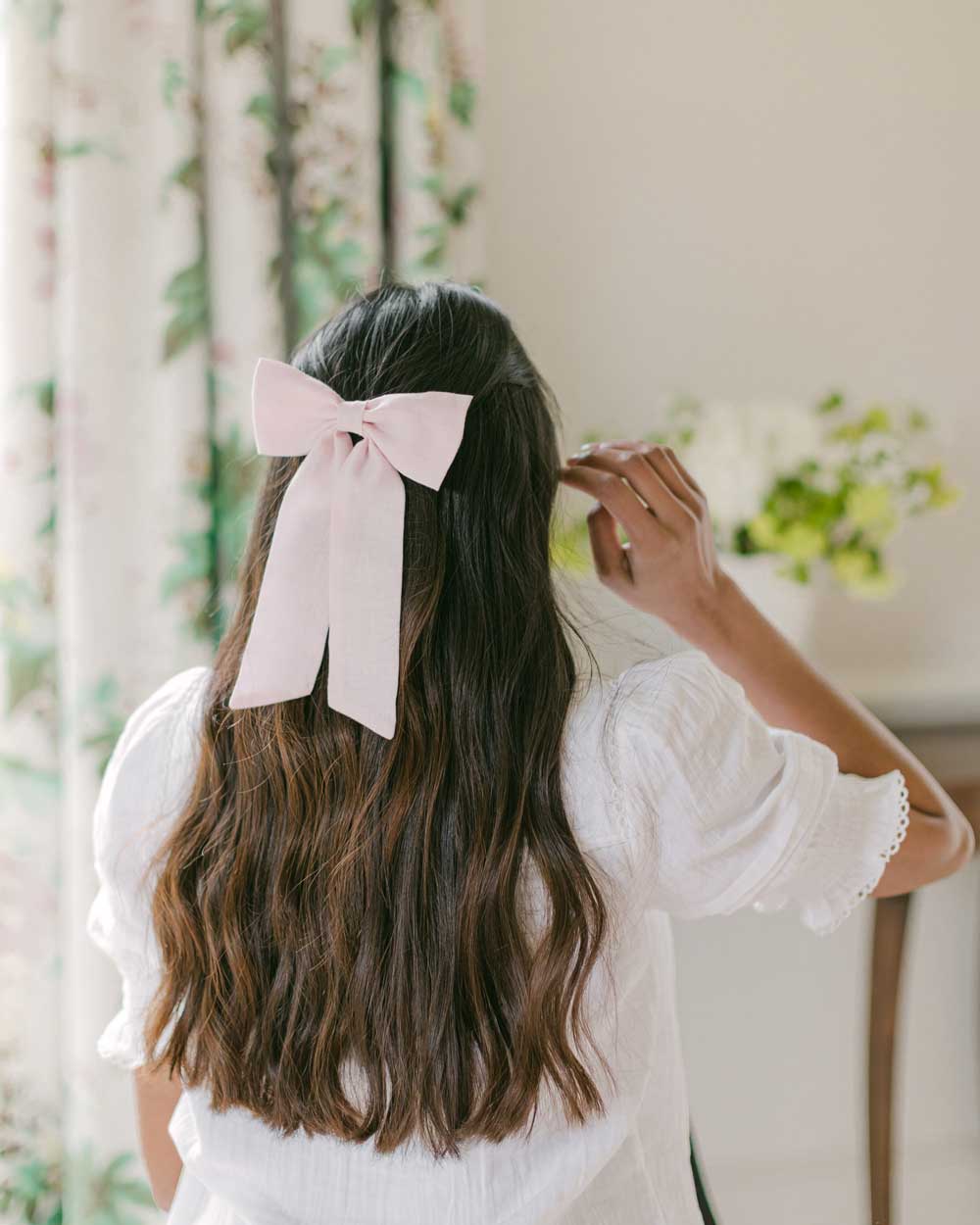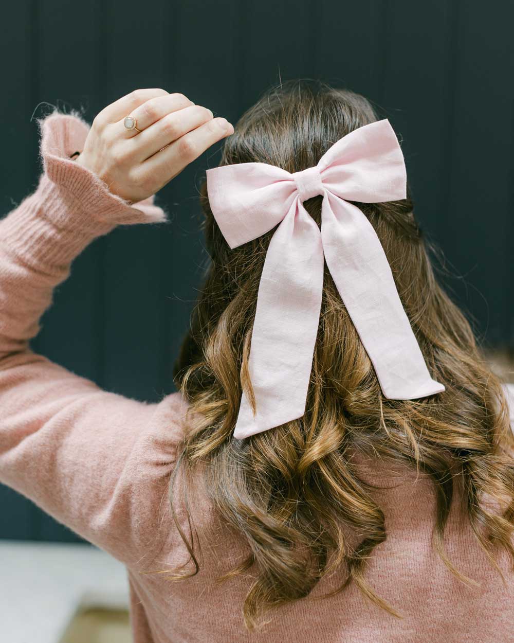 How to wear If you have thinner hair Clementine & Mint hair bows can be fixed with the crocodile closure to hold a half up hair style simply. If your hair is on the thicker side you can simply fix the hair bow over a pre pinned hair style, Model wears hair bow over a pre pinned half up hair style. See our Instagram and Tik Tok for more hair styling inspiration.