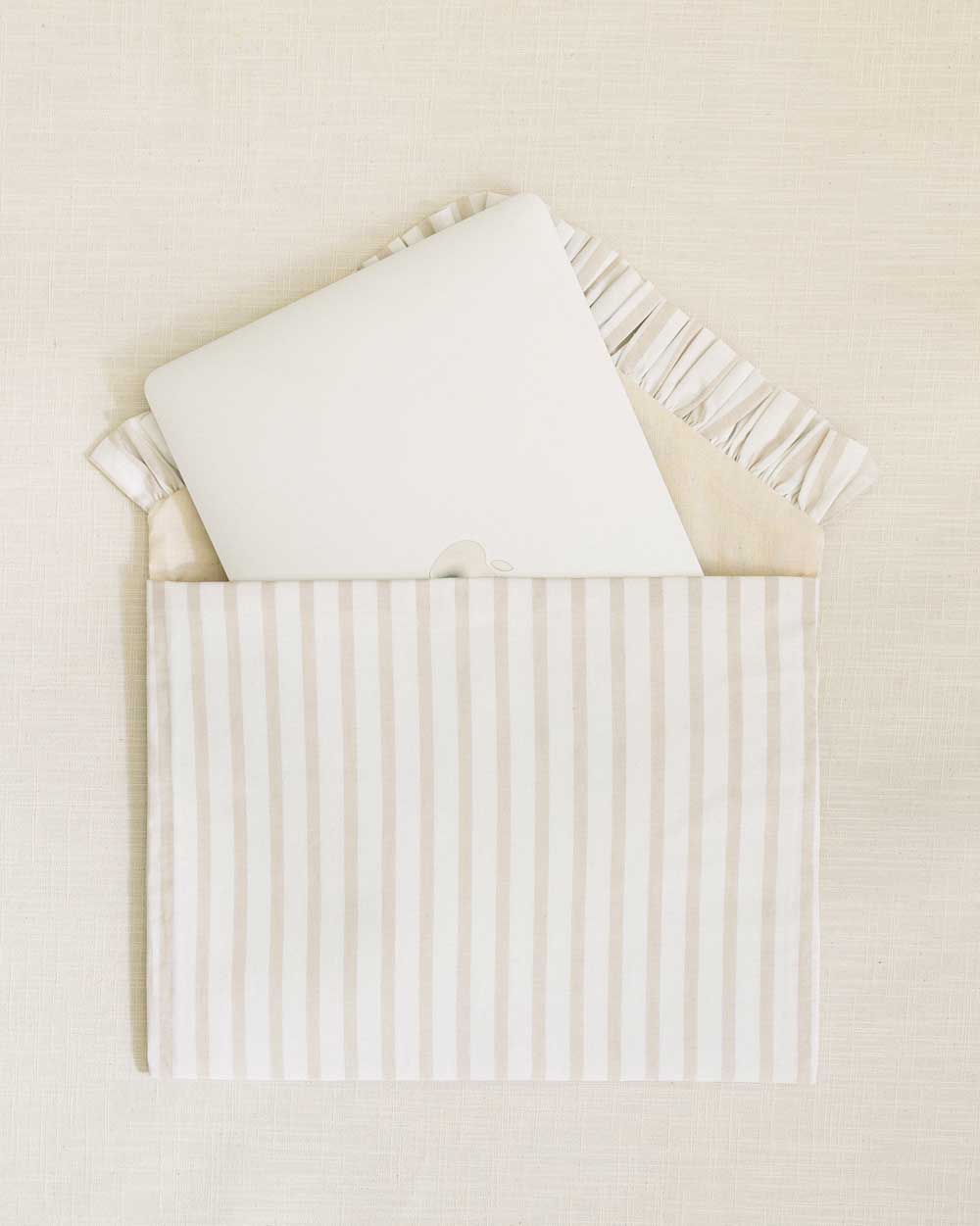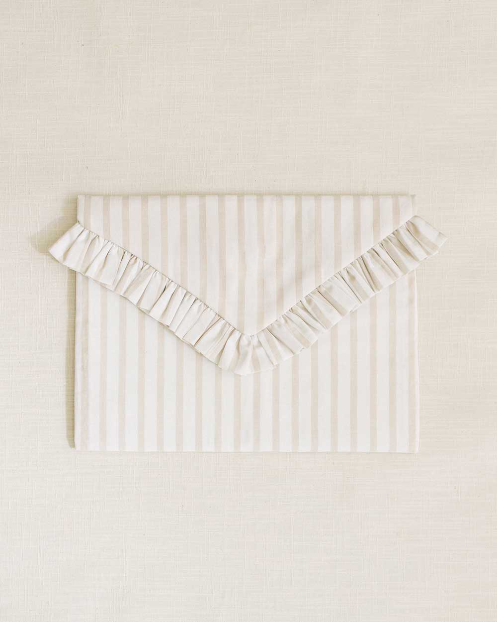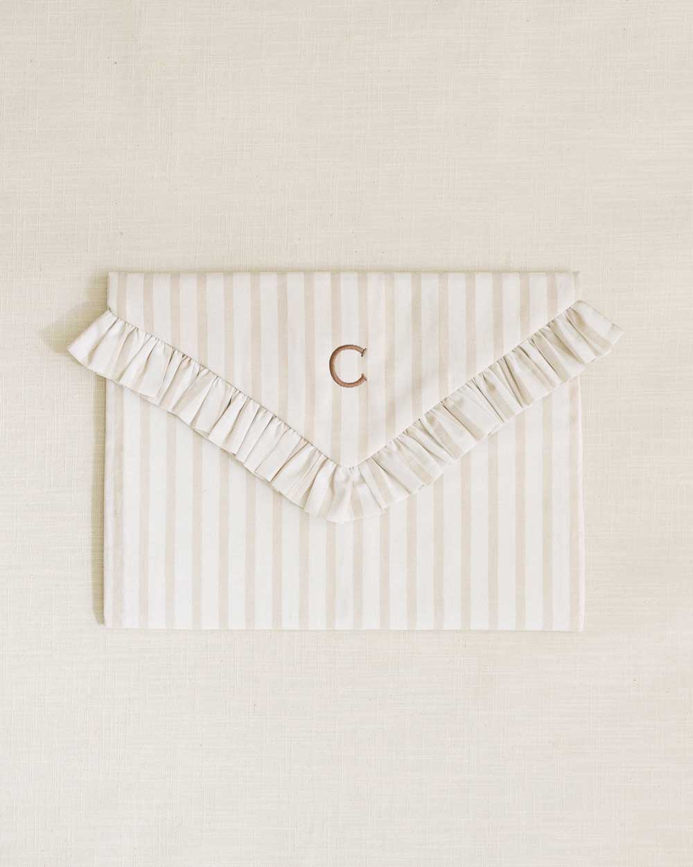 The Clementine & Mint laptop sleeve will elevate your laptop storage as a safe and stylish solution. Featuring our signature ruffle detail, a tab closure and a large internal pocket which is the perfect size to store a few of your everyday essentials. Our laptop sleeve will add a touch of luxury to your everyday. Handmade in our stuido in Wiltshire with an internal pocket and soft velcro tab closure to keep your laptop secure.