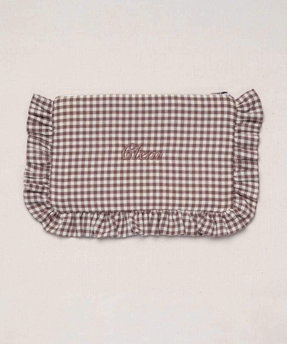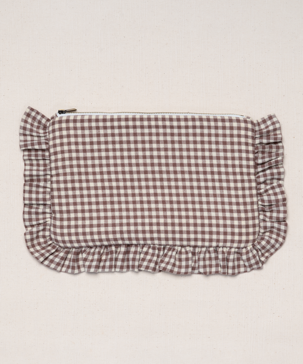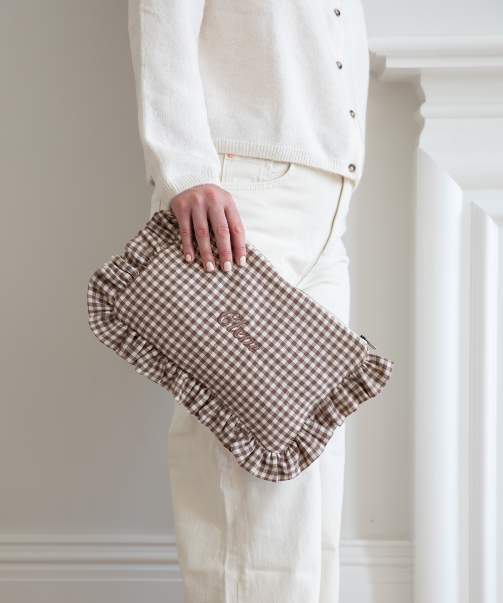 Our Ruffled Pouch will become your go to everyday organisation saviour. Perfect for storing your everyday handbag essentials, toiletries, travel essentials and even used as a clutch. Handmade in our studio in Wiltshire with an aged brass zip closure.
